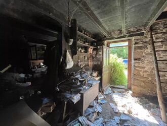 Un séjour/cuisine avec cheminée à foyer ouvert, une chambre, un couloir donnant sur une salle de douche, un bureau et un WC. Grenier au-dessus.
