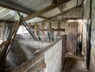 En face: un bâtiment construit en parpaing et couvert en tôles à usage d'anciens toits à porcs, hangar en côté construit sur poteaux en agglo.